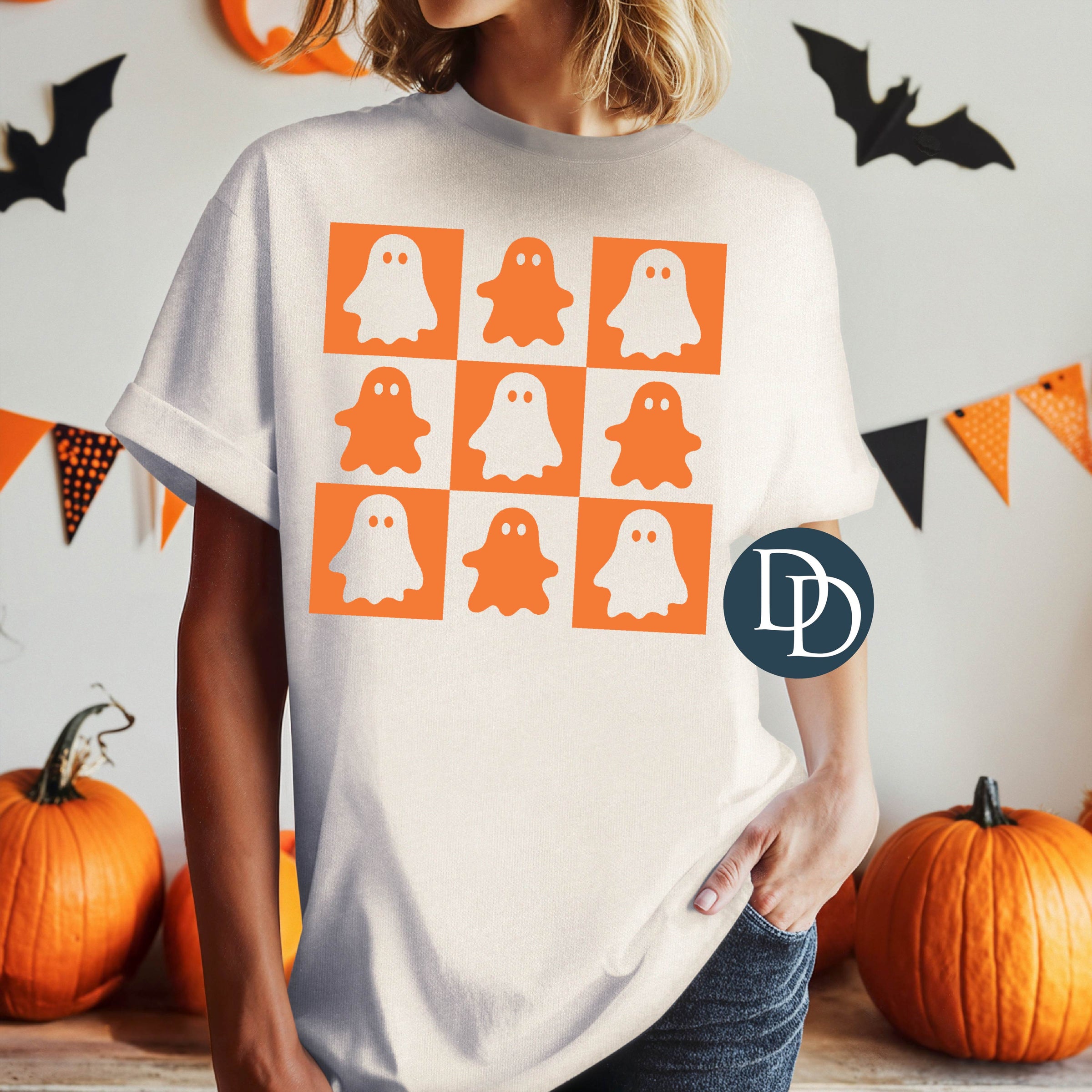 Cute Ghost Checkerboard (Bright Orange Ink) *Screen Print Transfer*